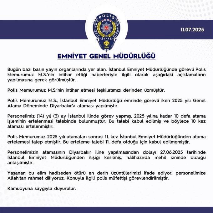 Fazla çalışma, mesai ücretlerinin ödenmemesi, Mobbing gibi süreçlerle mücadele eden emniyet teşkilatının sorunları çözülmedikçe, meslekten istifa edenlerin ve intihara süreklenenlere her geçen bir yenisi ekleniyor. Tayin talepleri gözardı edildiği bildirilen iki çocuk babası Polis Memuru Mehmet Selçuk, beylik tabancası ile intihar eti.  İstanbul’da çalışan polis memuru Mehmet Selçuk, ardında iki sayfalık bir veda mektubu bırakarak hayatına son verdi. Beylik tabancasıyla intihar eden Selçuk, mektubunda ailesine duygusal vedalar yazarken, Emniyet Teşkilatı’na yönelik sert eleştirilerde bulundu.
